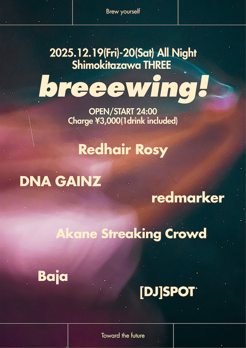 breeewing! DATE: 2025/12/19(Fri) OPEN / START 24:00 TICKET ADV : ¥3,000(+1D) -ACT- Redhair Rosy / DNA GAINZ / redmarker / Akane Streaking Crowd / Baja -DJ- SPOT