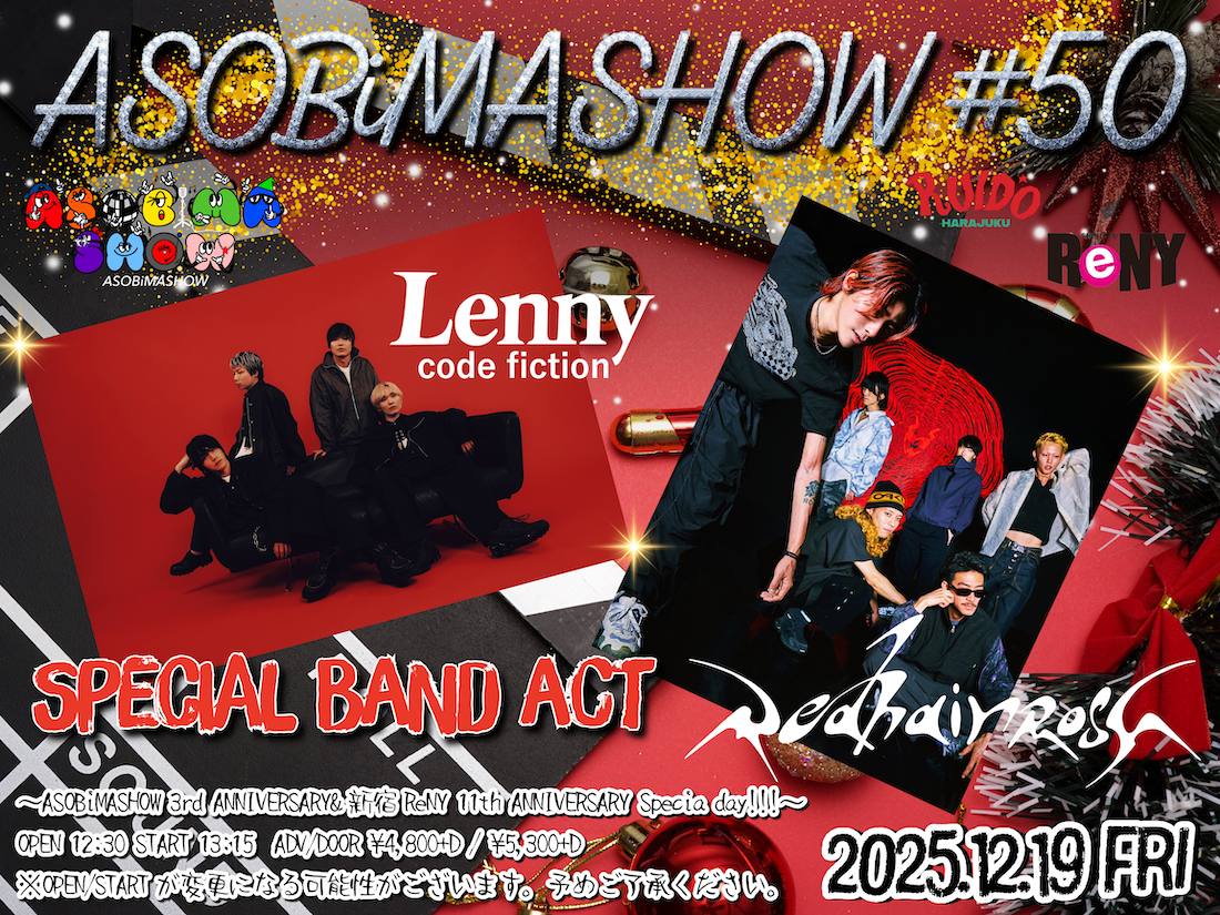 原宿RUIDOpresents. ASOBiMASHOW #50 〜ASOBiMASHOW 3rd ANNIVERSARY&新宿ReNY 11th ANNIVERSARY Specia day!!!〜 DATE: 2025/12/19(Fri) OPEN / START 12:30 / 13:15 TICKET ADV : ¥4,800(+1D ¥700) https://eplus.jp/sf/detail/4428980001 -ACT- ヤスイカズマ / 財部亮治 / BLACK PEPPER / 相原裕成 / N0NAME / Meik -SPECIAL BAND ACT- Lenny code fiction / Redhair Rosy お問い合わせ 原宿RUIDO 03-6447-5567