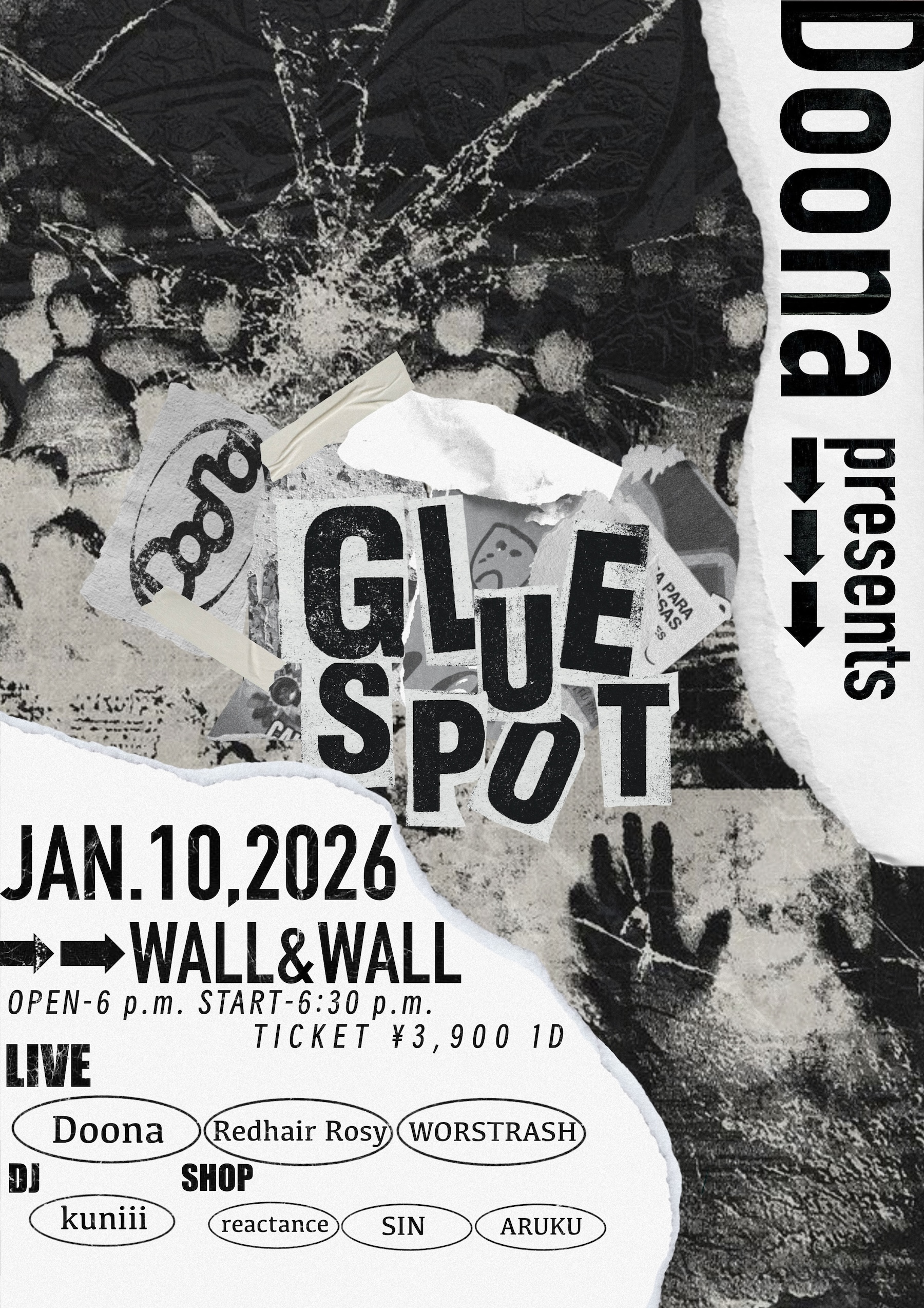 Doona presents “GLUE SPOT” DATE: 2026/1/10(Sat) OPEN / START 18:00 / 18:30 TICKET ADV : ¥3,900(+1D) https://l-tike.com/doona/ -ACT- Doona / Redhair Rosy / WORSTRASH -DJ- kuniii -shop- reactance SIN ARUKU