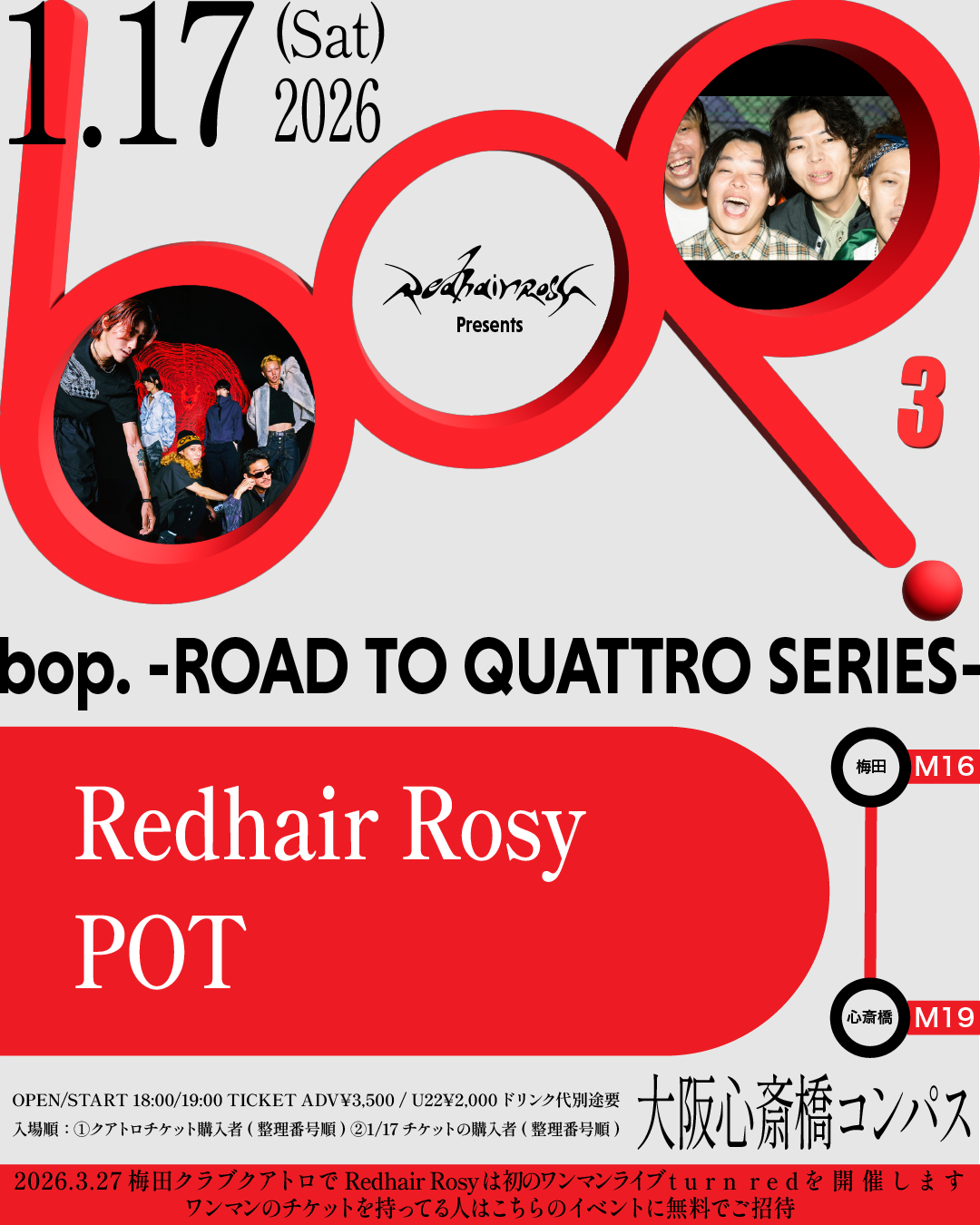 bop.3 DATE: 2026/1/17(Sat) 大阪・東心斎橋CONPASS OPEN / START 18:00 / 19:00 ACT : Redhair Rosy / POT Ticket : ADV/¥3,500+1D U22/¥2000+1D Redhair Rosyのワンマンチケット持参で入場無料(別途1D)