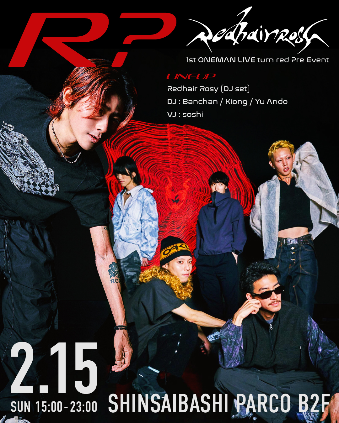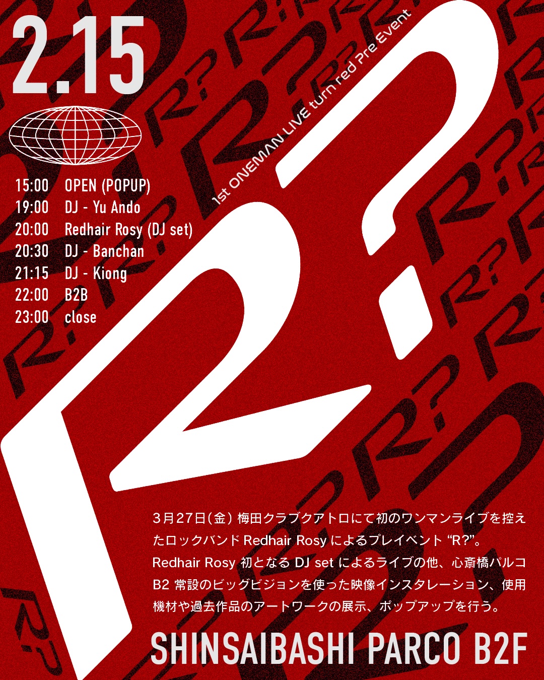3月27日(金)梅田クラブクアトロで開催される 1st ONEMAN LIVE 「turn red」に向けたプレイベント このプレイベントは「R?」と題し、Redhair Rosy初となるDJ setによるライブの他、心斎橋パルコB2常設のビッグビジョンを使った映像インスタレーション、使用機材、過去作品のアートワーク展示、ポップアップなどを行う タイトル : Redhair Rosy 1st ONEMAN LIVE turn red Pre Event 「R?」 日時 : 2026年2月15日(日) 会場 : 大阪・心斎橋PARCO B2 TANK酒場 時間 : 展示&ポップアップ 15:00〜 / DJ 19:00〜 DJ : Yu Ando / Banchan / Kiong Vj : soshi