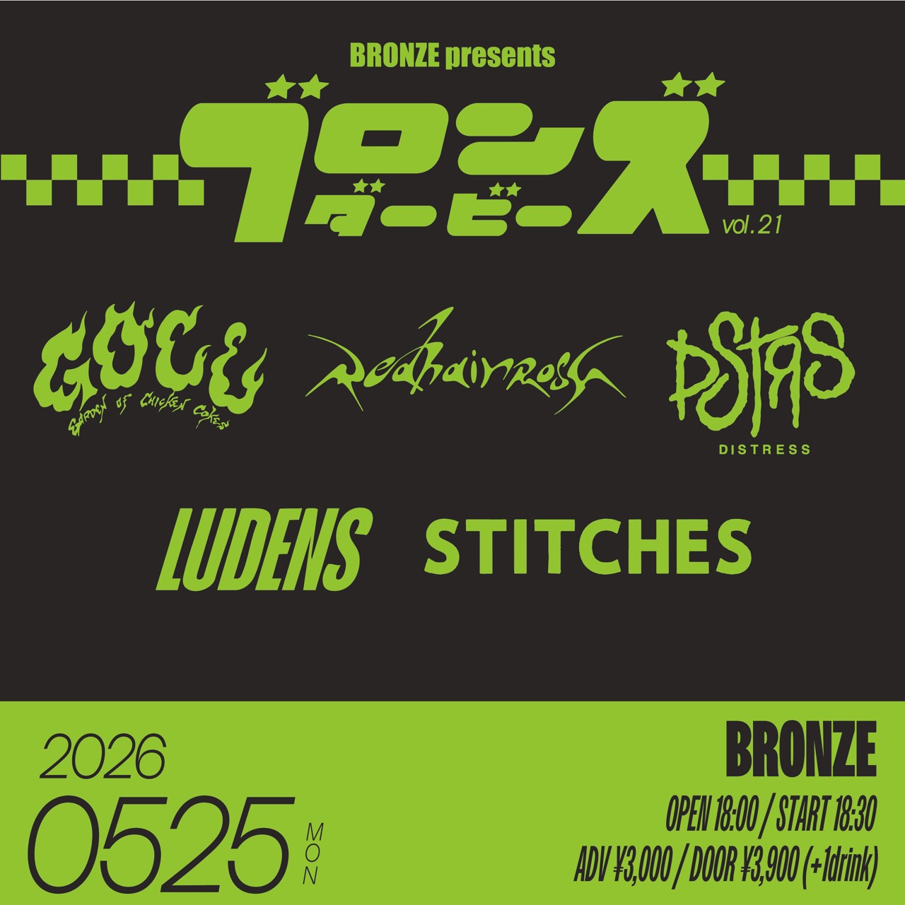 BRONZE presents 「ブロンズダービー」 Gaden Of Chicken Cokes LUDENS STITCHES DISTRESS Redhair Rosy OPEN 18:00 / START 18:30 ADV ¥3,000 / DOOR ¥3,900 (+1drink) https://eplus.jp/sf/detail/4510260001-P0030001